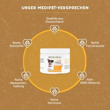 Der Stoffwechsel deines Hundes wird durch die ausgesuchten Mineralien im Medidog Barf Complete unterstützt und kann so normal funktionieren. Für die Gesundheit deines Hundes sind Mineralstoffe unabdinglich. Ohne diese lebenswichtigen Mineralien kann der Organismus deiner Fellnase nicht optimal funktionieren.