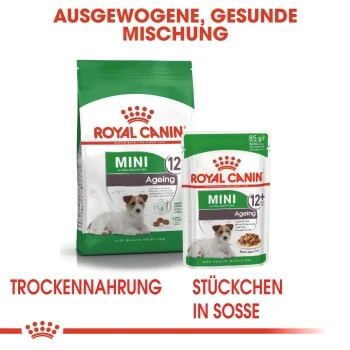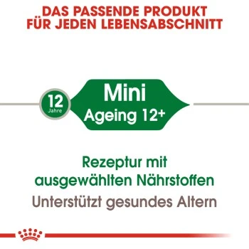 Royal Canin Mini Ageing 12+ ist für Hunde kleiner Rassen über 12 Jahren mit einem Gewicht von bis zu 10 kg geeignet und wurde speziell an die Ernährungsbedürfnisse kleiner Hunde angepasst.
